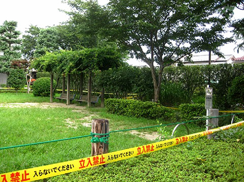 8月1日の向井公園。公園を解体する工事が予定されているというので朝7時半ごろ公園に行ってみるとすでに、公園のまわりじゅうが黄色い「立入禁止」テープで囲まれていました。事件現場みたいです。